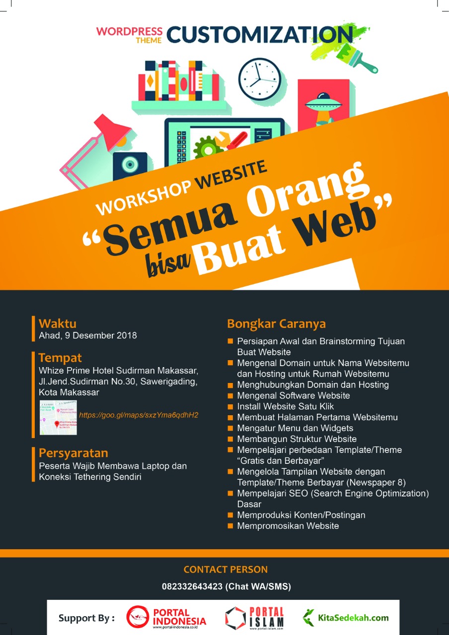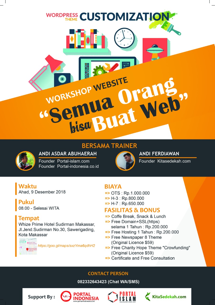 INFOMAKASSARKEKINIAN.COM – Workshop Website Customization “Semua Orang bisa buat Web” berlangsung pada Ahad, 9 Desember 2018, Pukul : 08.00 – selesai WITA yang berlokasi di Whiz Prime Hotel Makassar.